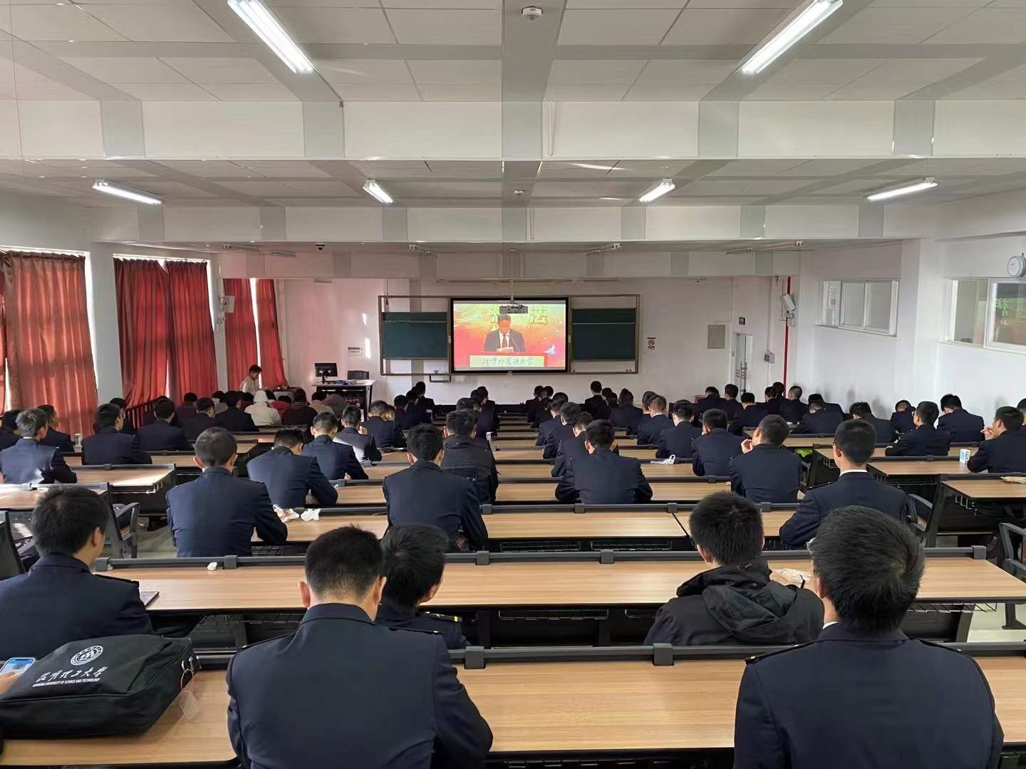主题团课中, 杨杰老师带领学生一起学习宪法的内容及习近平总书记关于宪法重要论述精神,让学生充分理解宪法的重要作用。接着,徐良老师组织全体在场学生一同观看第八届国家宪法日“宪法晨读”活动网络直播。活动中,全体学生认真参与,跟读宪法部分条款,跟唱《宪法伴我们成长》歌曲。