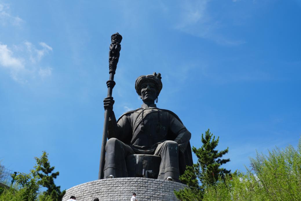 在讲解员的介绍下,团队成员了解到六祖文化广场以彝族人文始祖阿普笃慕及其六子“分支迁徙”为核心,依托老鸹岩下的“葡萄井”而建。根据彝文典籍《西南彝志》的记载,彝族在经历了一场严重的洪水灾害后,由始祖阿普笃慕主持,将族人分为武、乍、糯、恒、布、默六支,每两支形成联盟,向不同方向迁徙和拓疆。这一历史活动,后来被称为“六祖分支”,对彝族的文化和社会结构产生了深远的影响。这一历史事件,不仅塑造了彝族的地理分布,还深刻影响了其文化和社会结构。团队成员伫立于21米高的阿普笃慕铜像之下,瞻仰其身着华丽传统服饰、目光深邃的庄严身姿,同时参照彝族博物馆内珍藏的《指路经》古籍及迁徙路线图,深刻感受到了这一历史事件对彝族分布格局带来的深远影响。“《指路经》不仅是彝族祭祀活动中的经典文本,它还详细记录了彝族先民的迁徙历史,相当于一幅详尽的‘迁徙地图’。”