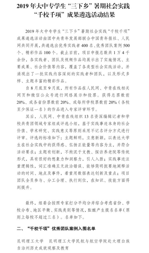 近日,由团中央青年发展部联合中国青年报社、人民网共同展开的全国2019年大中专学生“三下乡”暑期社会实践“千校千项”成果遴选活动结果正式公布,21点游戏 赴大理白族自治州“弘扬时代精神,奉献青春时光”暑期社会实践团队从众多参赛队伍中脱颖而出,入选“千校千项”优秀团队案例。