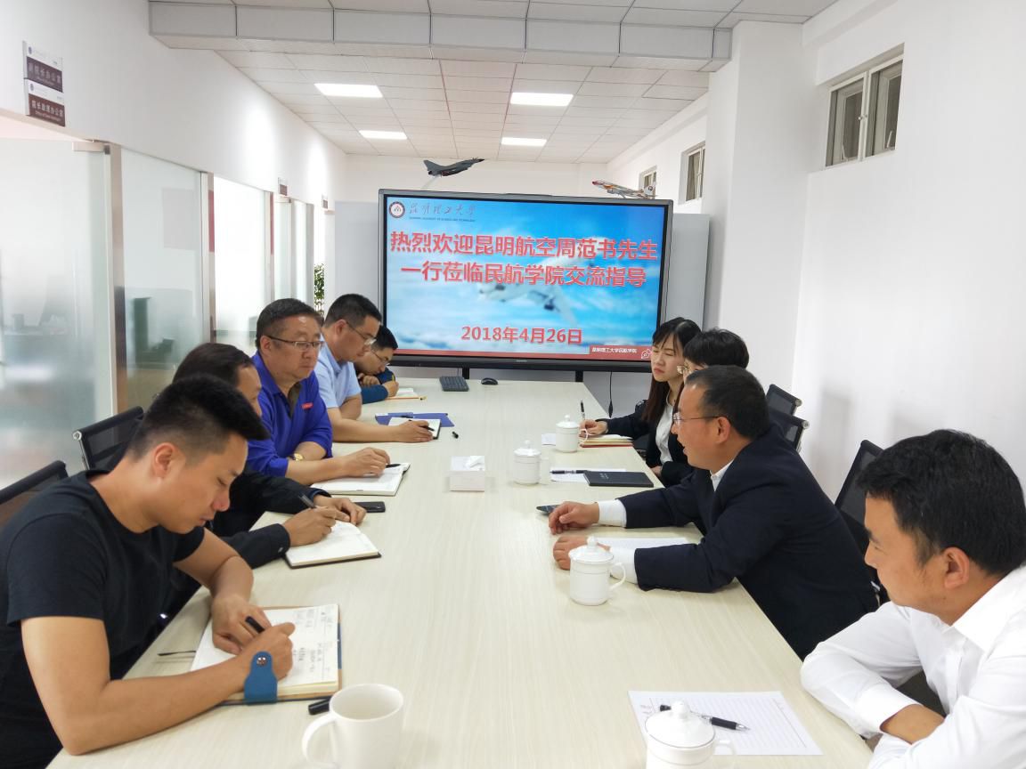 2018年4月26日,昆明航空有限公司总裁助理、人力资源及行政总监周范书一行4人到民航学院,就如何落实人才培养等具体合作事宜进行商谈。民航学院书记赵耕、院长刘增力、副书记周业林及相关人员参加座谈交流。