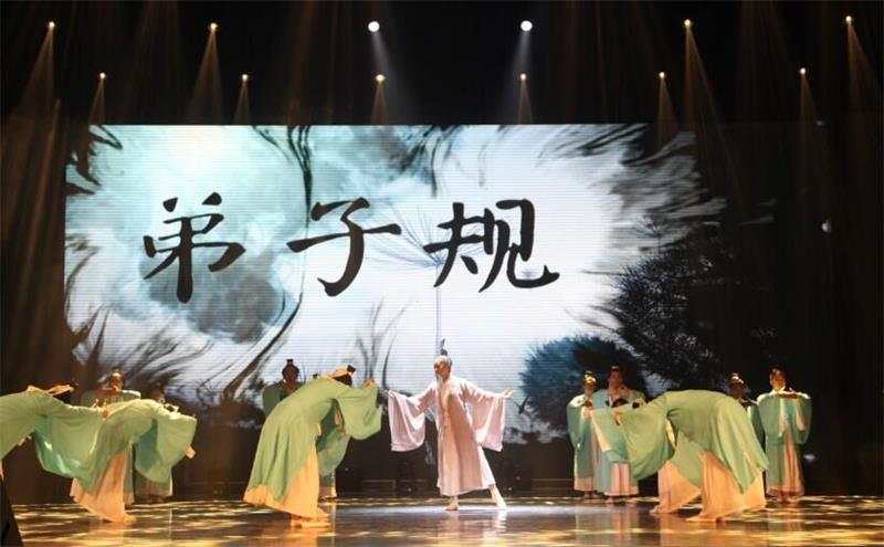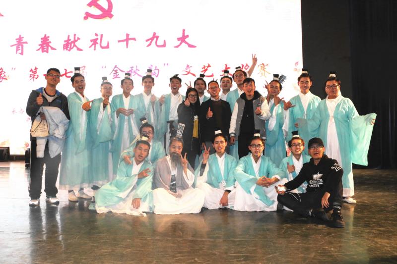 在前三个参赛节目结束后,我院的《师道》在同学们的欢呼声中来到,开篇“华夏之美,隽秀永恒,书之美,为天地立心,为生民立命,为往圣继绝学,为万世开太平。舞之美,翩翩惊鸿,婉若游龙,霓裳曳广带,大美,中国风!”一字一声,铿锵有力说进观众心里,而这也正是我院《师道》所要表达与呈现的主题。他们跟随着节拍和大气韵味的背景音乐起舞,着青色汉服的书生们和一袭灰袍的老夫子,捧在手里的书筒,一个一个的鞠躬,无不让人想起华夏悠久的文明和生生不息的师道文化。礼与教形影不离,三人行,必有我师焉。勤共勉,必有好未来。