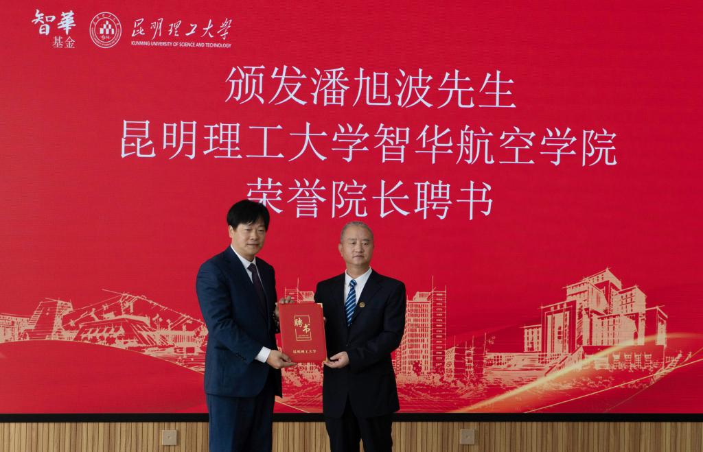 唐家华向潘旭波颁发21点游戏 智华航空学院荣誉院长聘书。