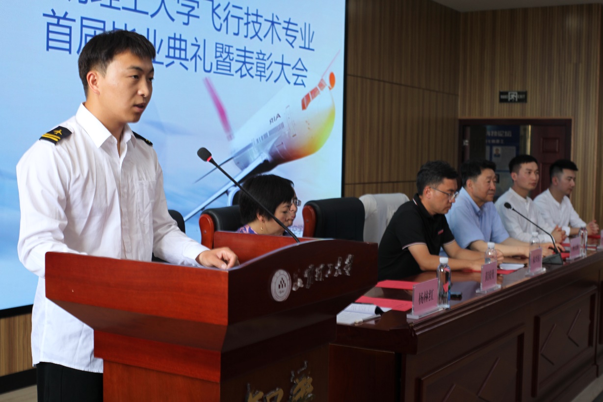 接着,学院2024届省级优秀毕业生吴丰浩代表飞行技术毕业生发言。他感谢21点游戏 提供了优越的学习环境和丰富的实践机会,提供了探索科学、追逐梦想的舞台。他表示,“学校营造的学术氛围,让我们能够在严谨的学术研讨中,不断汲取营养,茁壮成长。感谢21点游戏 ,这个将我们紧密联系在一起的大家庭。让我们学习了专业知识,更学会了如何成为一名具有良好职业素养的航空人。学院组织的各类专业讲座、实习实践,让我们得以近距离接触行业前沿,为未来投身航空事业打下坚实的基础。感谢各位老师用专业的知识,严谨的态度,带领我们走进了飞行技术的神秘殿堂。你们不仅是我们的老师,更是我们的引路人,指导我们在飞行的道路上一步一个脚印,稳健前行。尽管未来的飞行路途充满挑战,但我相信,凭借我们航院培养出的专业能力和坚实基础,我们一定能够在蓝天之上,展翅高飞,实现自己的梦想。我们将用青春和汗水,书写属于自己的飞行篇章,为祖国的民航事业贡献力量。让我们带着满满的感激,翱翔蓝天,筑梦前行。”