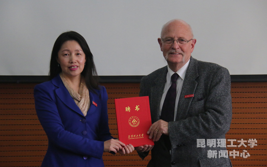 张英杰书记代表学校为 Thomas教授颁发了客座教授聘书,并佩戴校徽。
